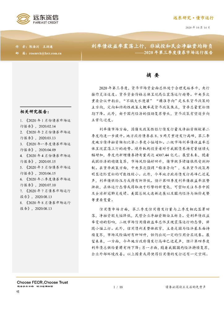远东资信:2020年第三季度债券市场运行报告:利率债收益率震荡上行,非城投和民企净融资均转负.pdf