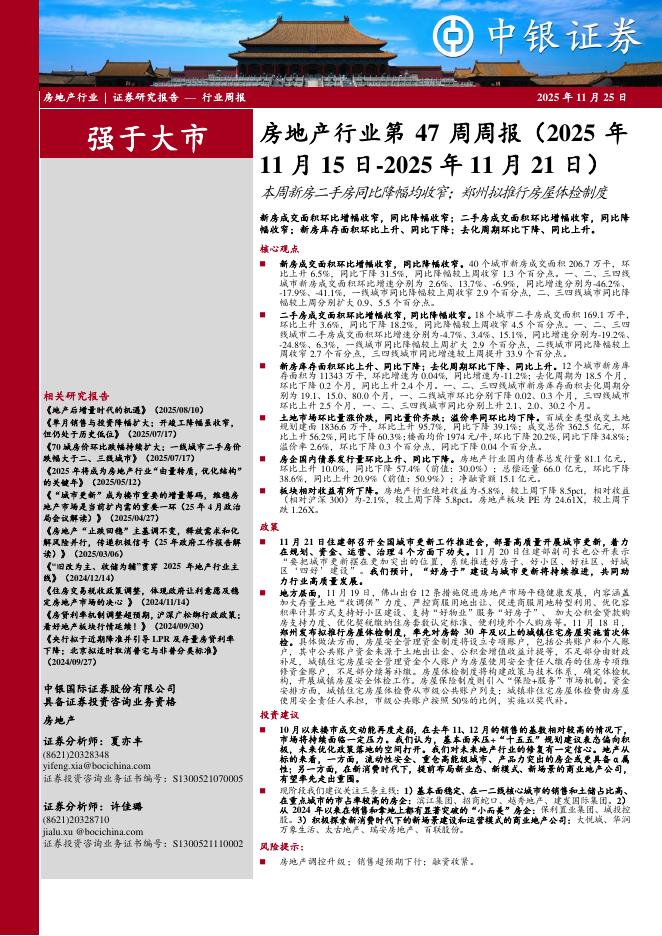 中银证券:房地产行业第47周周报:本周新房二手房同比降幅均收窄;郑州拟推行房屋体检制度.pdf