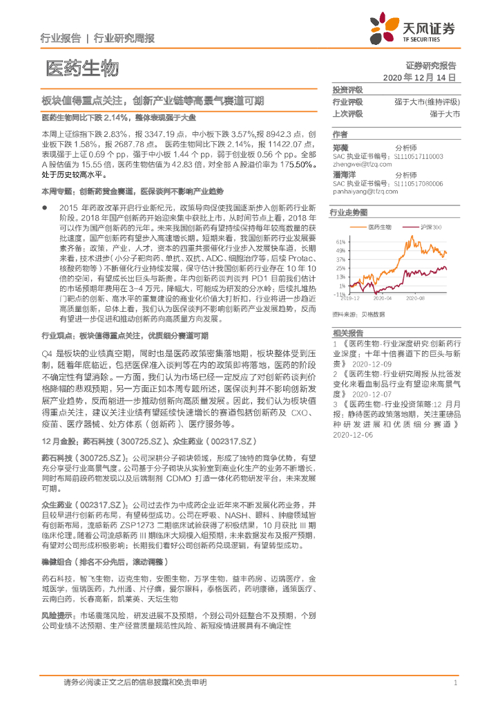 天风证券:医药生物行业研究周报:板块值得重点关注,创新产业链等高景气赛道可期.pdf