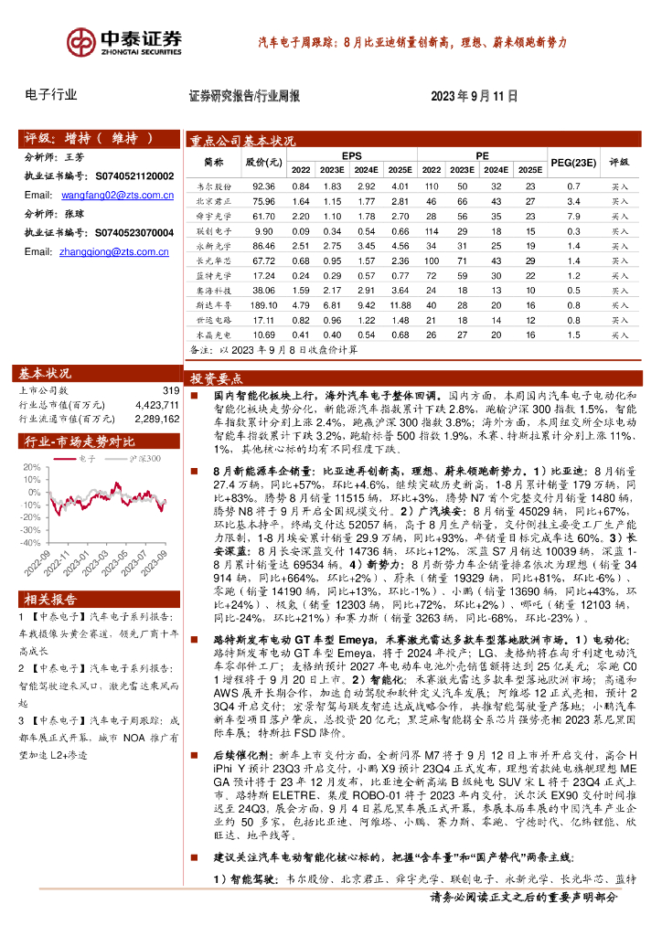 中泰证券:汽车电子周跟踪:8月比亚迪销量创新高,理想、蔚来领跑新势力.pdf