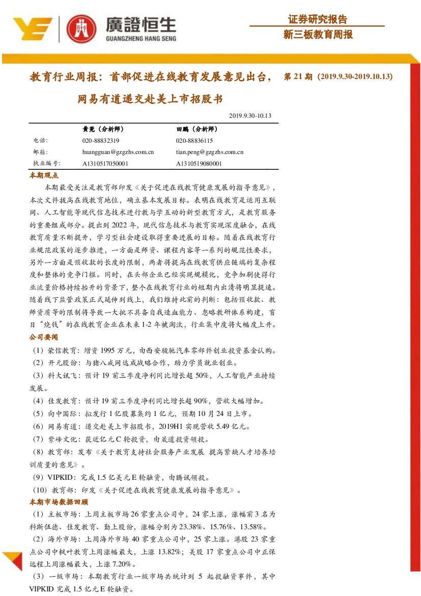 广证恒生证券研究所:教育行业周报:首部促进在线教育发展意见出台,网易有道递交赴美上市招股书.pdf