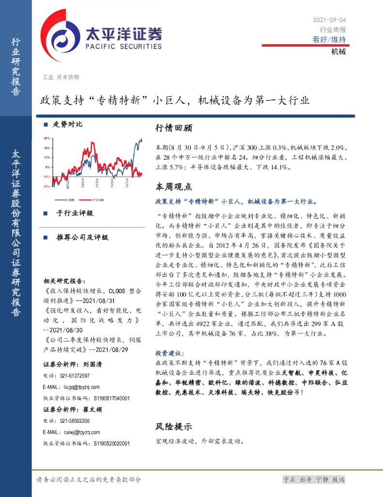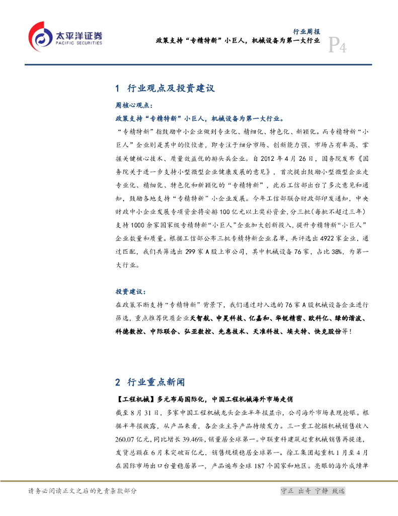 太平洋证券:机械行业周报:政策支持“专精特新”小巨人,机械设备为第一大行业.pdf