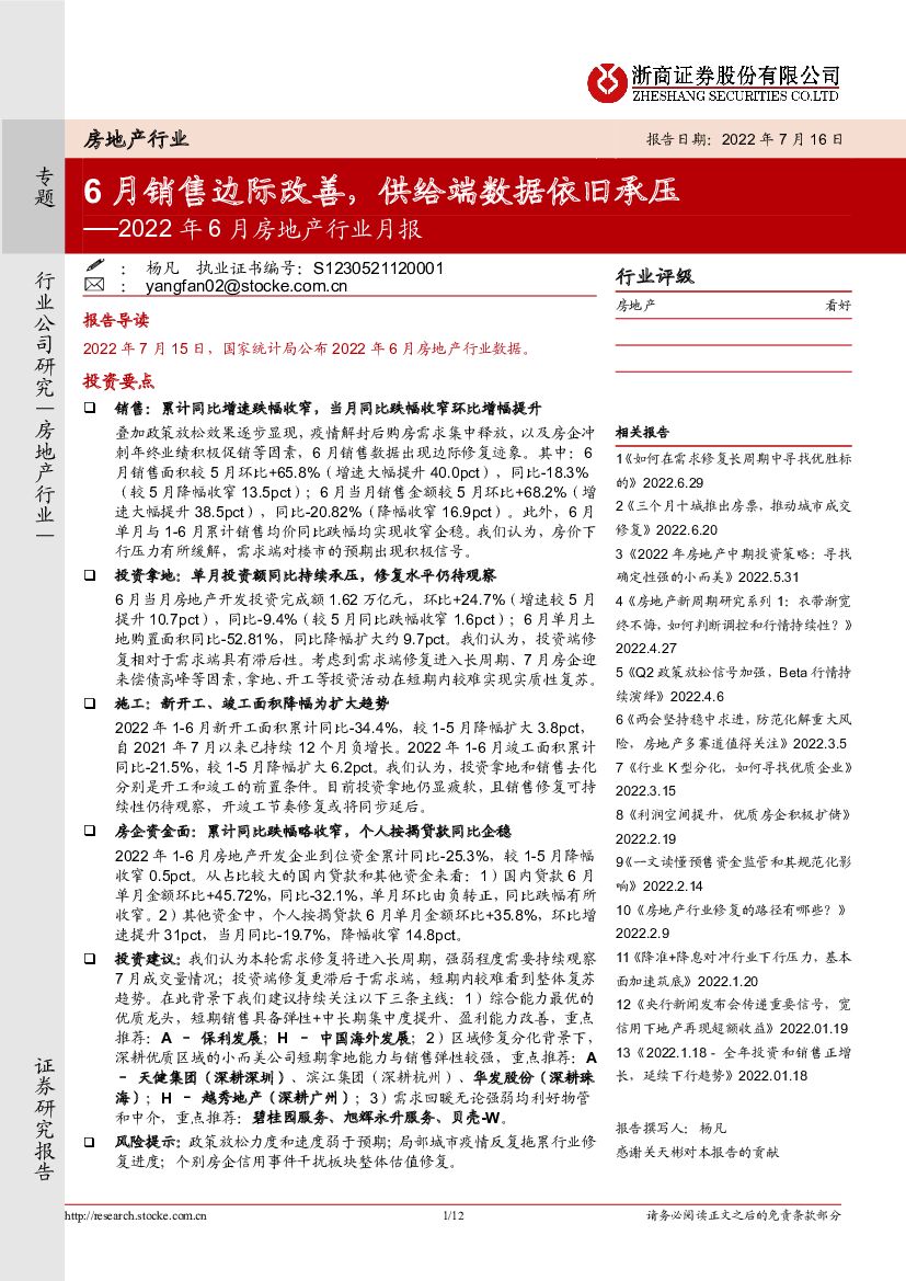 浙商证券:2022年6月房地产行业月报:6月销售边际改善,供给端数据依旧承压.pdf