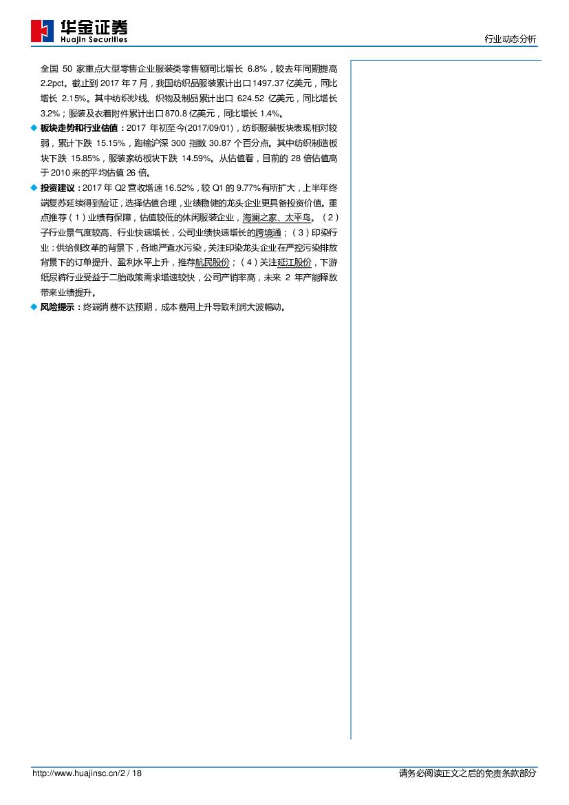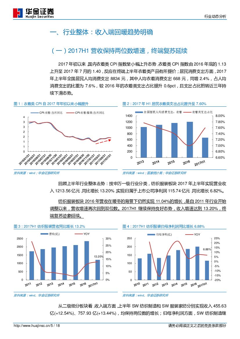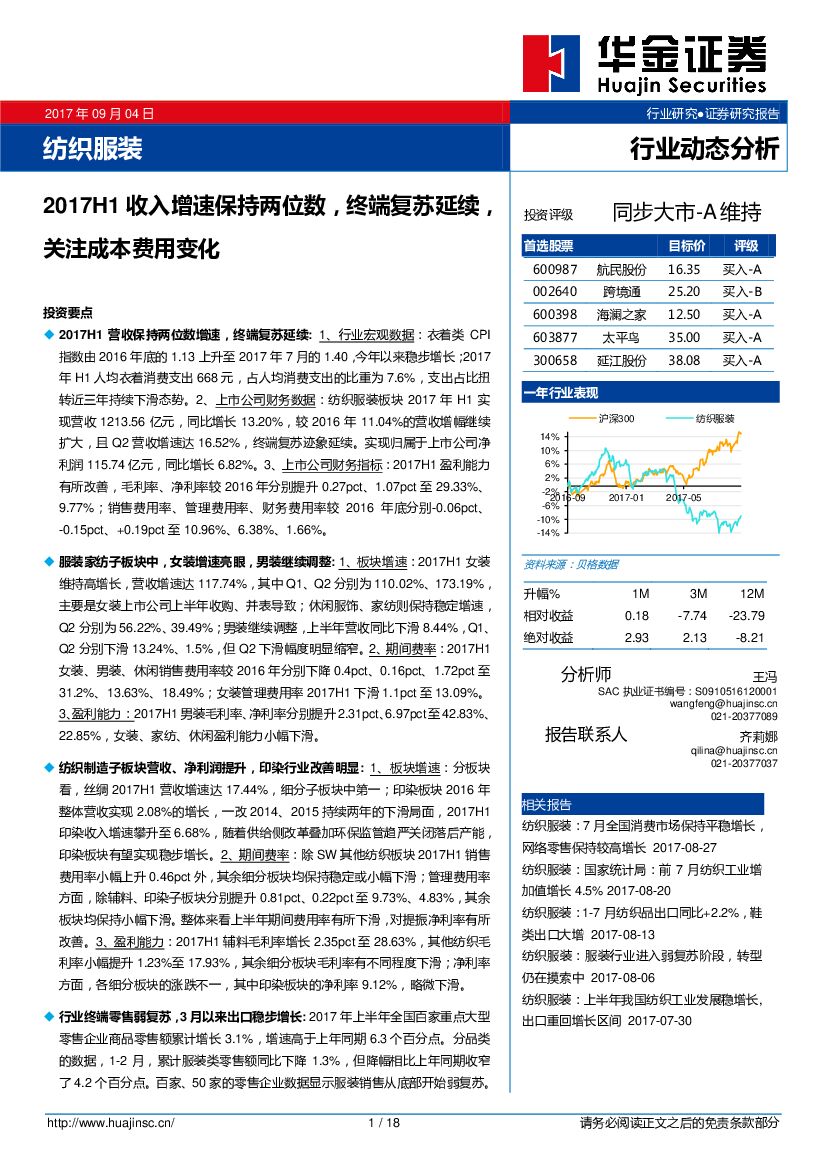 华金证券:纺织服装行业动态分析:2017H1收入增速保持两位数,终端复苏延续,关注成本费用变化.pdf