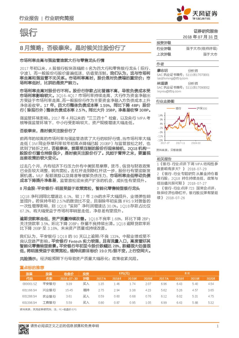 天风证券:银行行业研究简报:8月策略:否极泰来,是时候关注股份行了.pdf