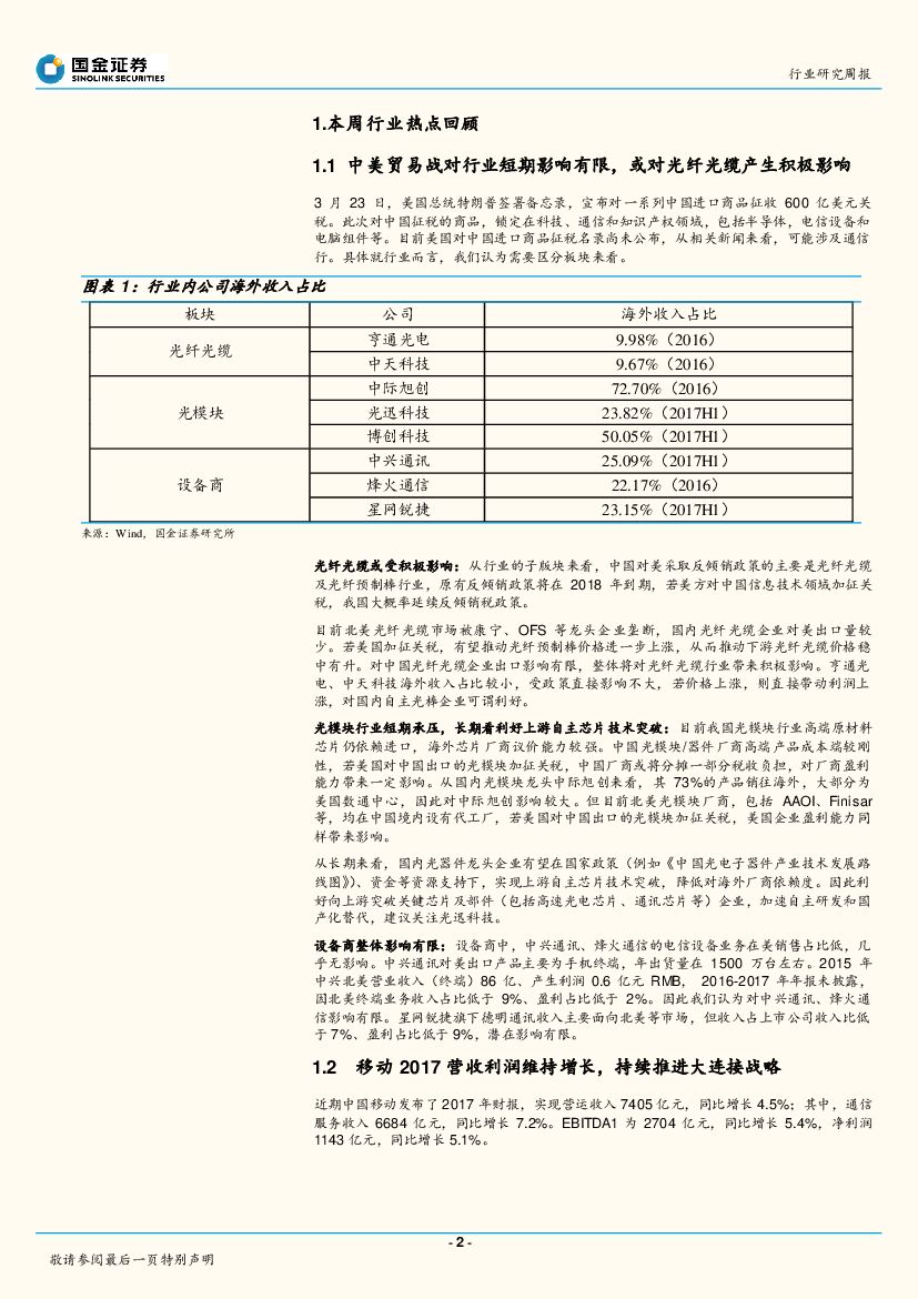 国金证券:通信行业研究周报:中美贸易战对行业影响有限 ,移动联通业绩亮眼资本开支或超预期.pdf