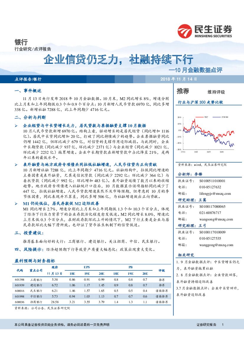 民生证券:银行:10月金融数据点评:企业信贷仍乏力,社融持续下行.pdf