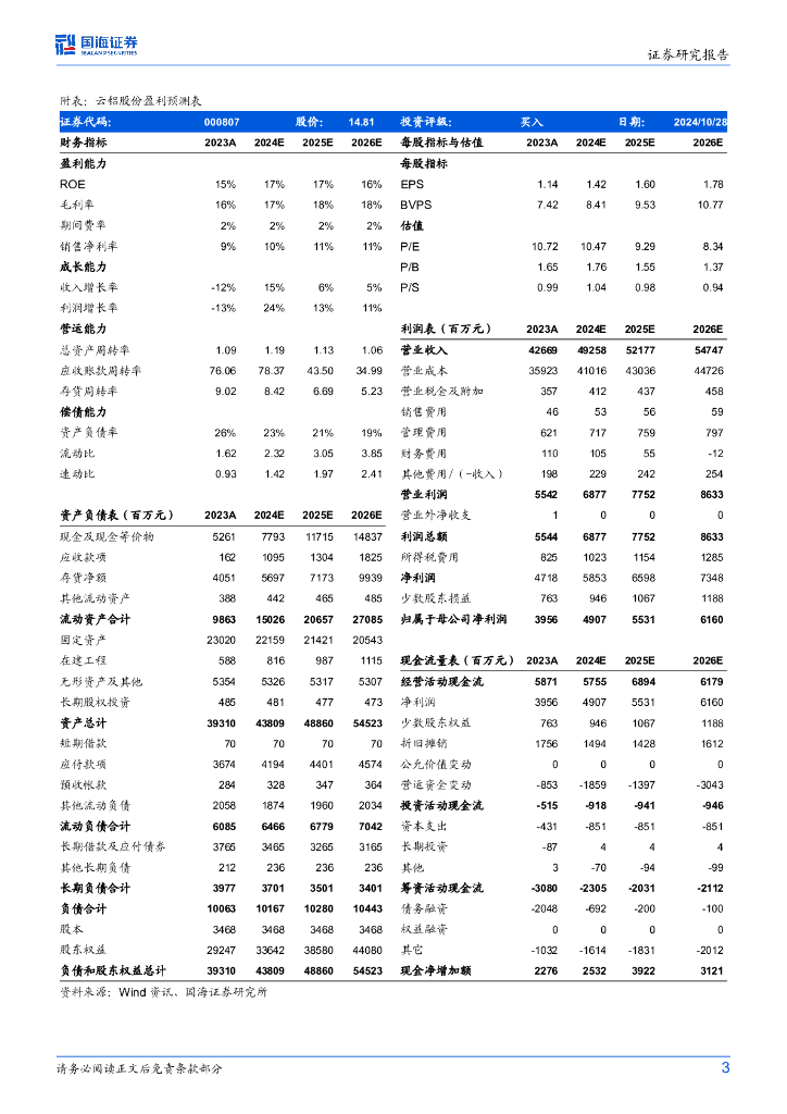 国海证券:云铝股份(000807)-2024年三季报点评:Q3产量环比进一步提升,铝价下跌影响业绩.pdf