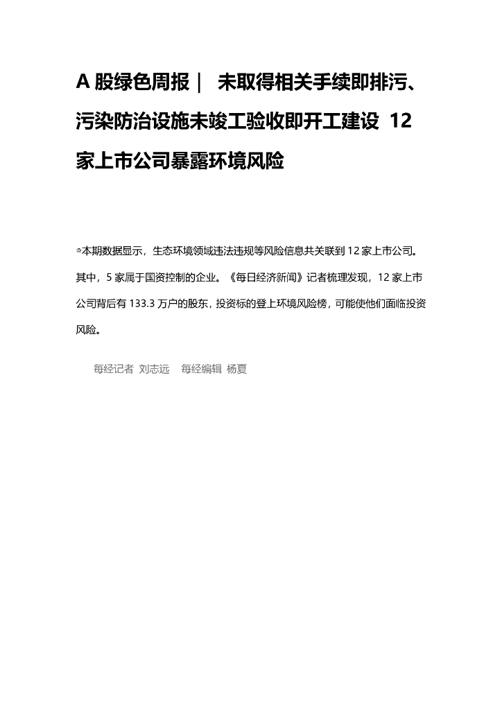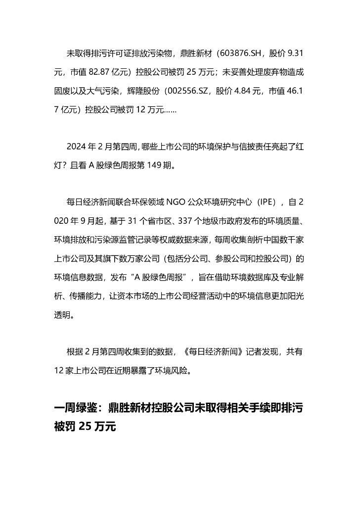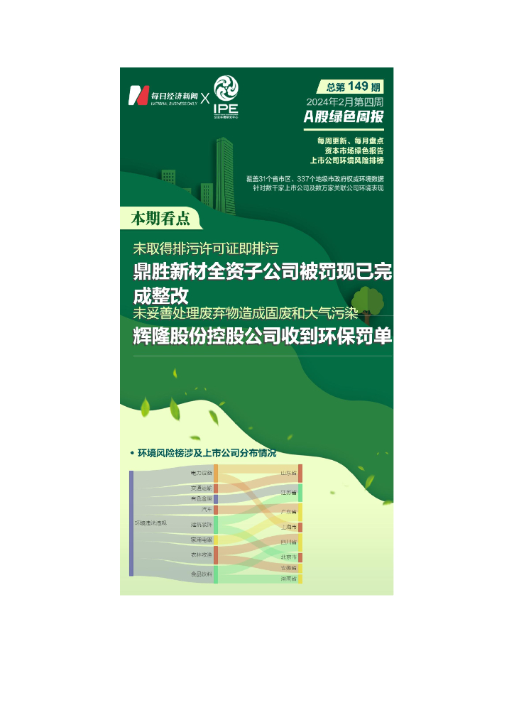 A股绿色周报(2024年2月第四周 总第149期):未取得相关手续即排污、污染防治设施未竣工验收即开工建设 12家上市公司暴露环境风险.pdf