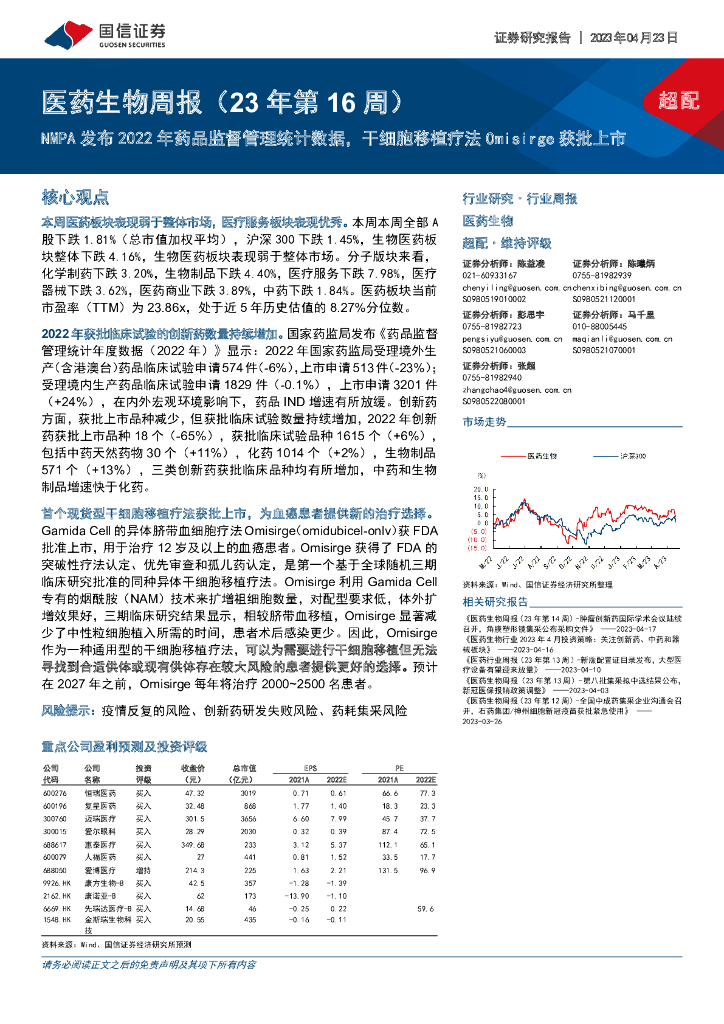 国信证券:医药生物周报(23年第16周):NMPA发布2022年药品监督管理统计数据,干细胞移植疗法Omisirge获批上市.pdf