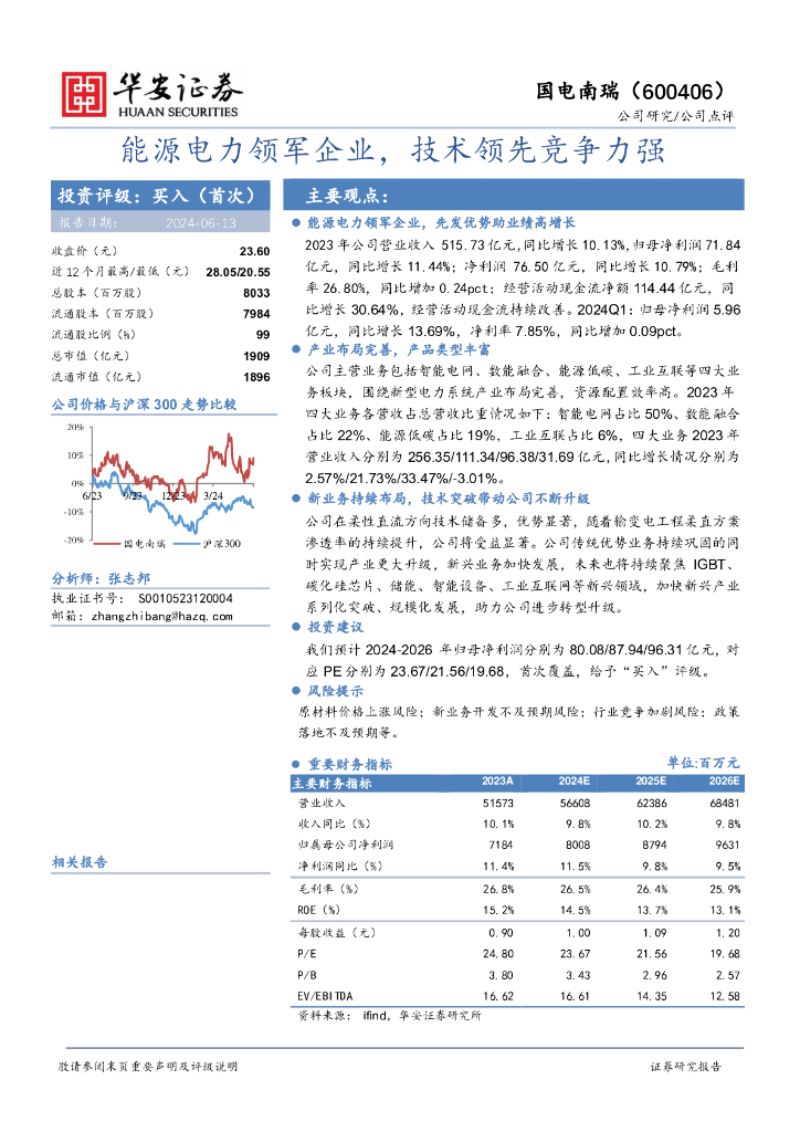 华安证券:国电南瑞(600406)-能源电力领军企业,技术领先竞争力强.pdf