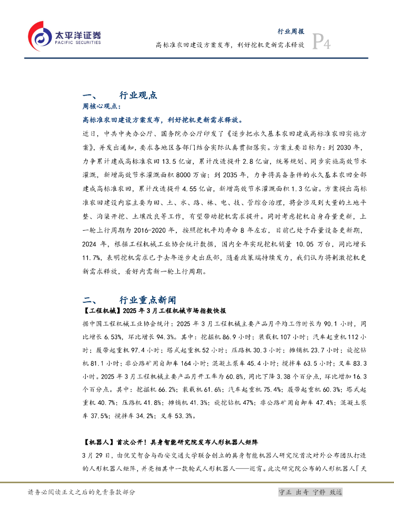太平洋证券:机械行业周报:高标准农田建设方案发布,利好挖机更新需求释放.pdf