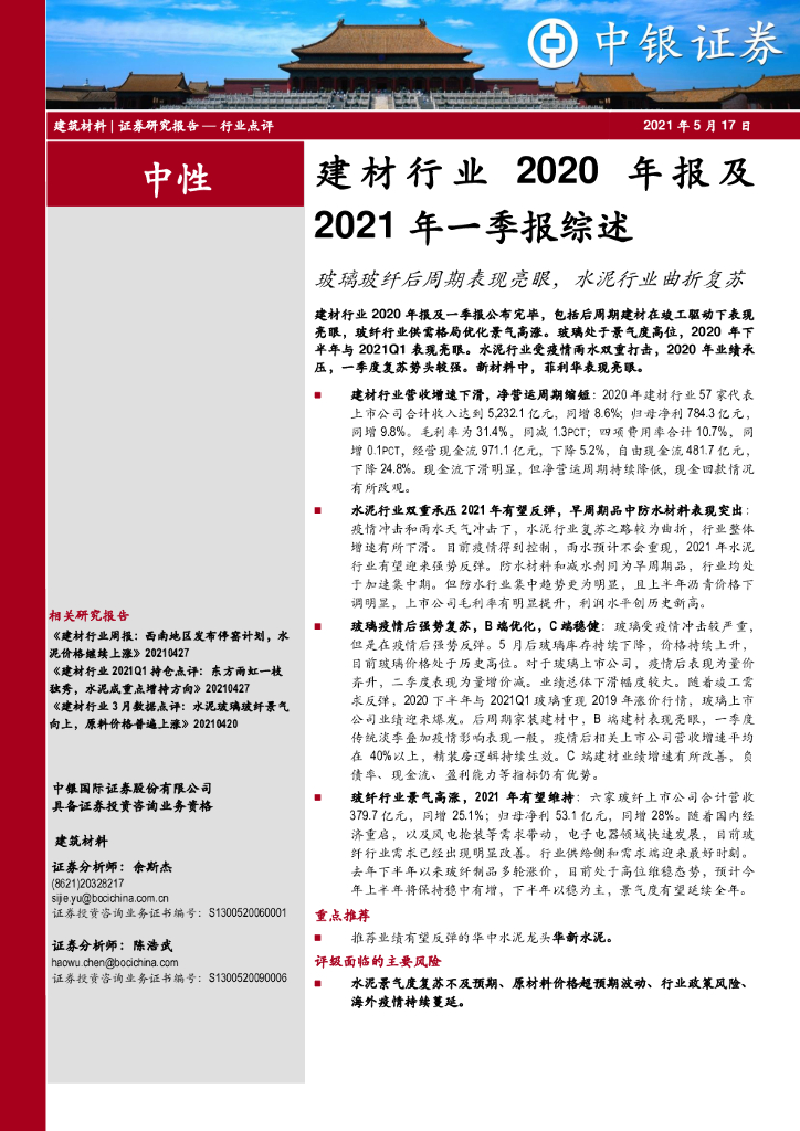 中银证券:建材行业2020年报及2021年一季报综述:玻璃玻纤后周期表现亮眼,水泥行业曲折复苏.pdf