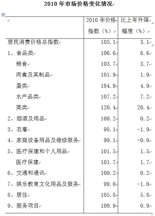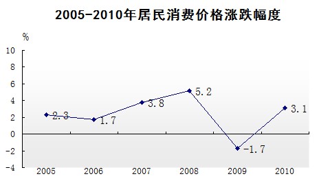 2010年,随着食品价格的上涨及原油、有色金属、棉花、粮食等国际大宗商品价格持续走强,总体物价水平呈逐步攀升的态势。全年累计,居民消费价格总指数上涨3.1%,其中消费品价格指数上涨3.9%。居民消费价格中,食品价格上升6.6%,其中,菜类和水产品价格分别上涨20.4%和7.2%;居住类价格上涨5.8%,其中水、电、燃料价格上涨10.0%。