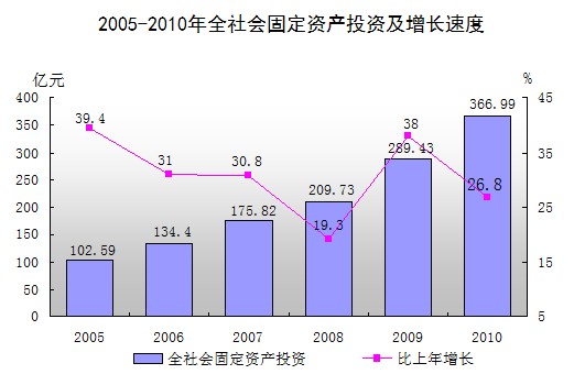 投资规模继续扩大。2010年,全市完成全社会固定资产投资366.99亿元,同比增长26.8%。其中,城镇以上固定资产投资300.33亿元,增长29.4%;农村固定资产投资66.65亿元,增长16.4%。