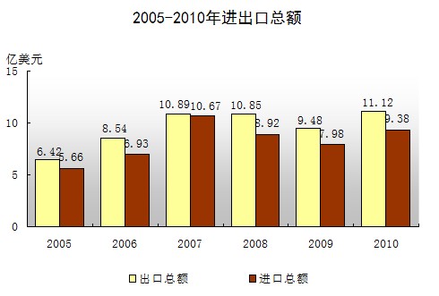 全年累计新签合同协议24宗,合同利用外商直接投资5.27亿美元,增长22.4%,实际吸收外商直接资2.85亿美元,增长3.1%。全年完成外贸进出口总值20.50亿美元,比上年增长17.4%,其中出口总值11.12亿美元,比上年增长17.3%。从贸易方式看,一般贸易出口1.85亿美元,增长49.9%;加工贸易出口9.26亿美元,增长12.2%。从经营主体看,“三资”企业占主导地位,累计出口8.98亿美元,增长19.8%,占80.8%。
