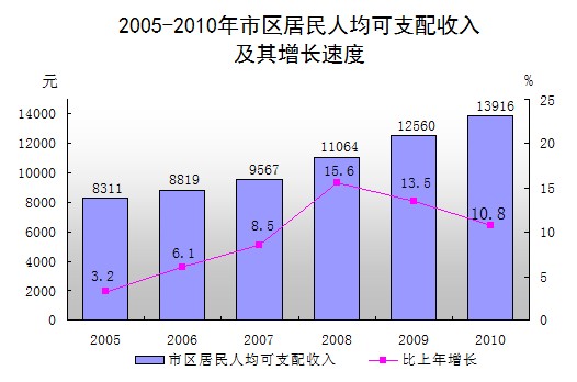 市区居民人均可支配收入13916元,增长10.8%,人均消费支出10013元,增长14.6%,市区居民家庭恩格尔系数为44.1%,比上年下降0.2个百分点。据劳动工资统计,全市在岗职工工资总额38.15亿元,比上年增长19.8%,在岗职工人均工资25501元,增长9.7%。