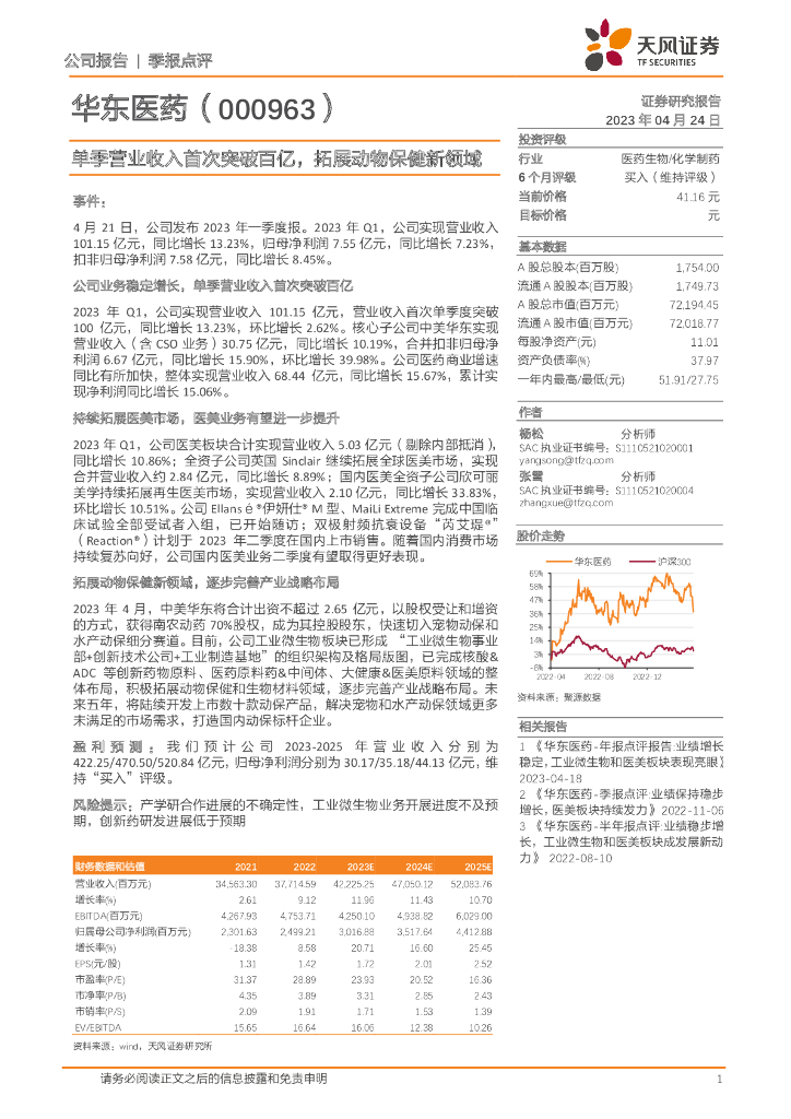 天风证券:华东医药(000963)-单季营业收入首次突破百亿,拓展动物保健新领域.pdf