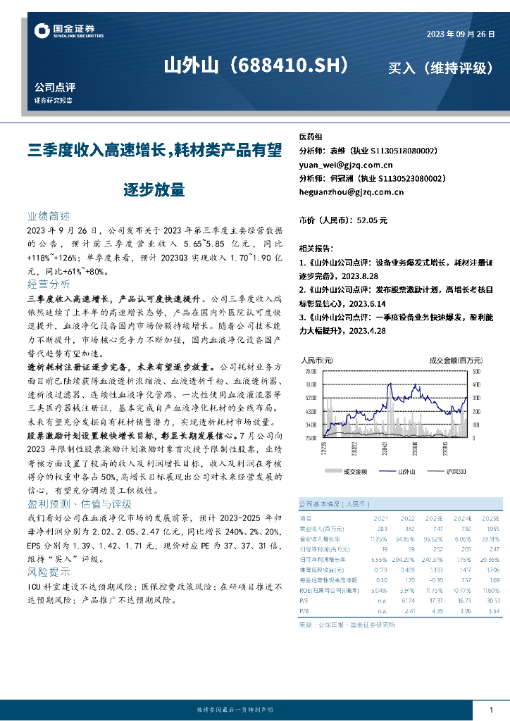 国金证券:山外山(688410)-三季度收入高速增长,耗材类产品有望逐步放量.pdf