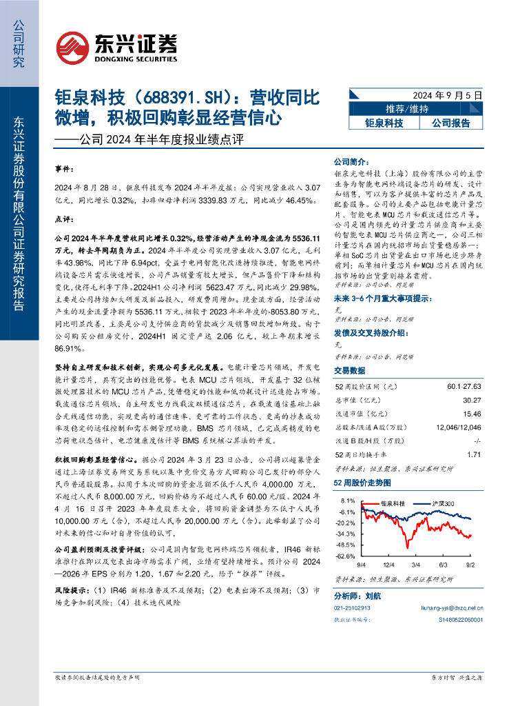 东兴证券:钜泉科技(688391)-公司2024年半年度报业绩点评:营收同比微增,积极回购彰显经营信心.pdf
