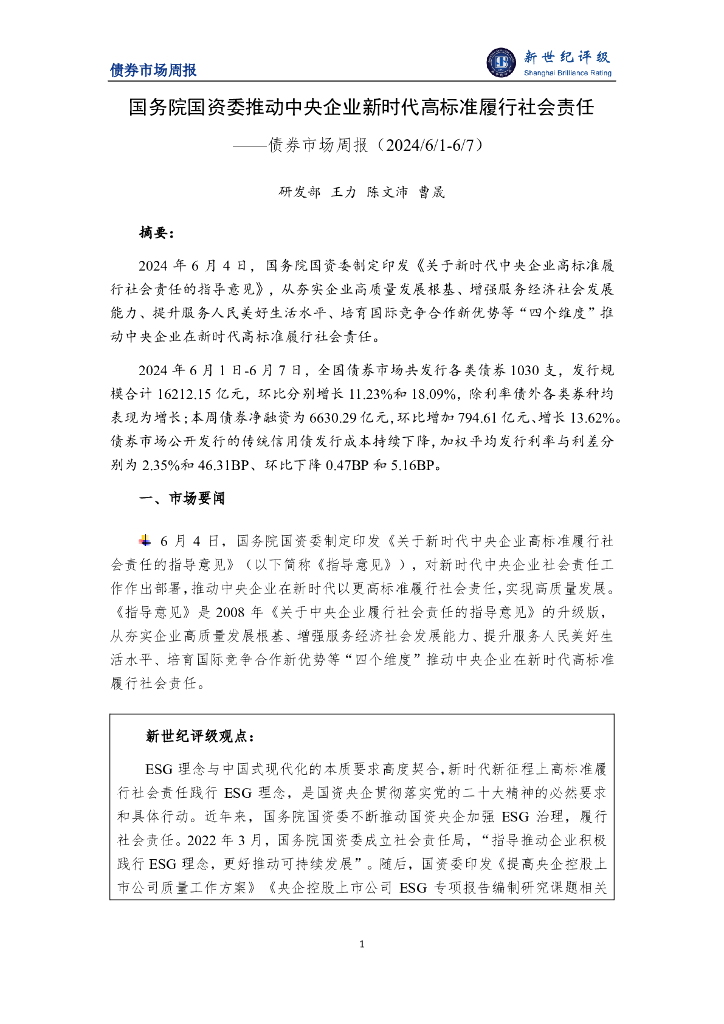 新世纪评级:国务院国资委推动中央企业新时代高标准履行社会责任——债券市场周报(2024/6/1-6/7).pdf