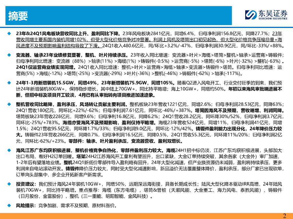 东吴证券:新能源行业-风电23年&24Q1总结:风电整机盈利承压,零部件分化明显.pdf