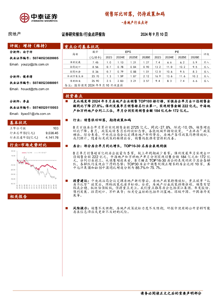 中泰证券:房地产行业点评:销售环比回落,仍待政策加码.pdf