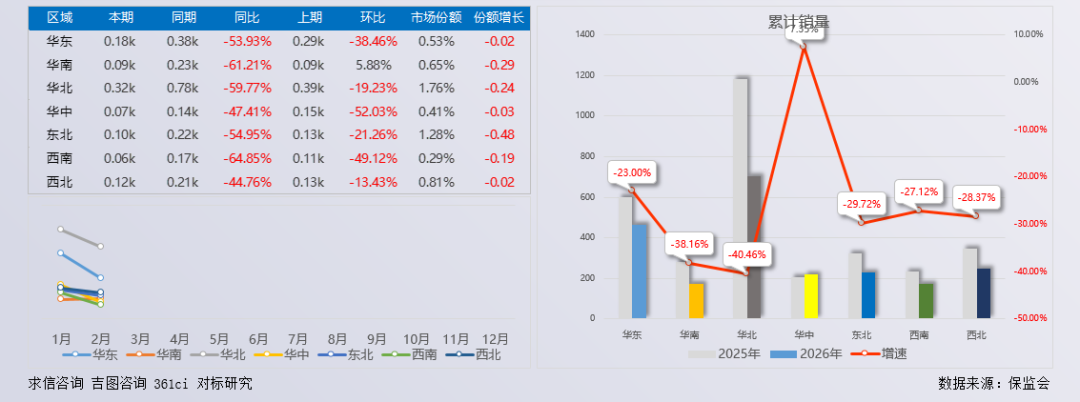 华北地区是该企业商用车销量主要来源地,同时市场份额也高于其他区域,本期销量315辆,同比增长-59.77%,环比增长-19.23%,销售占比379.52%,占当地市场份额1.76%;累计销量705辆,增速-40.46%。华东地区市场份额降幅最低本期销量176辆,占当地市场份额0.53%,较上年同期缩小0.02个百分点。