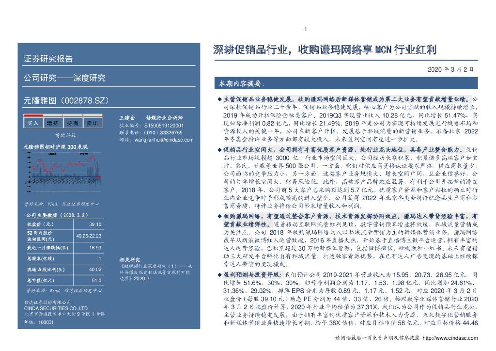 信达证券:元隆雅图(002878)-深度报告:深耕促销品行业,收购谦玛网络享MCN行业红利.pdf