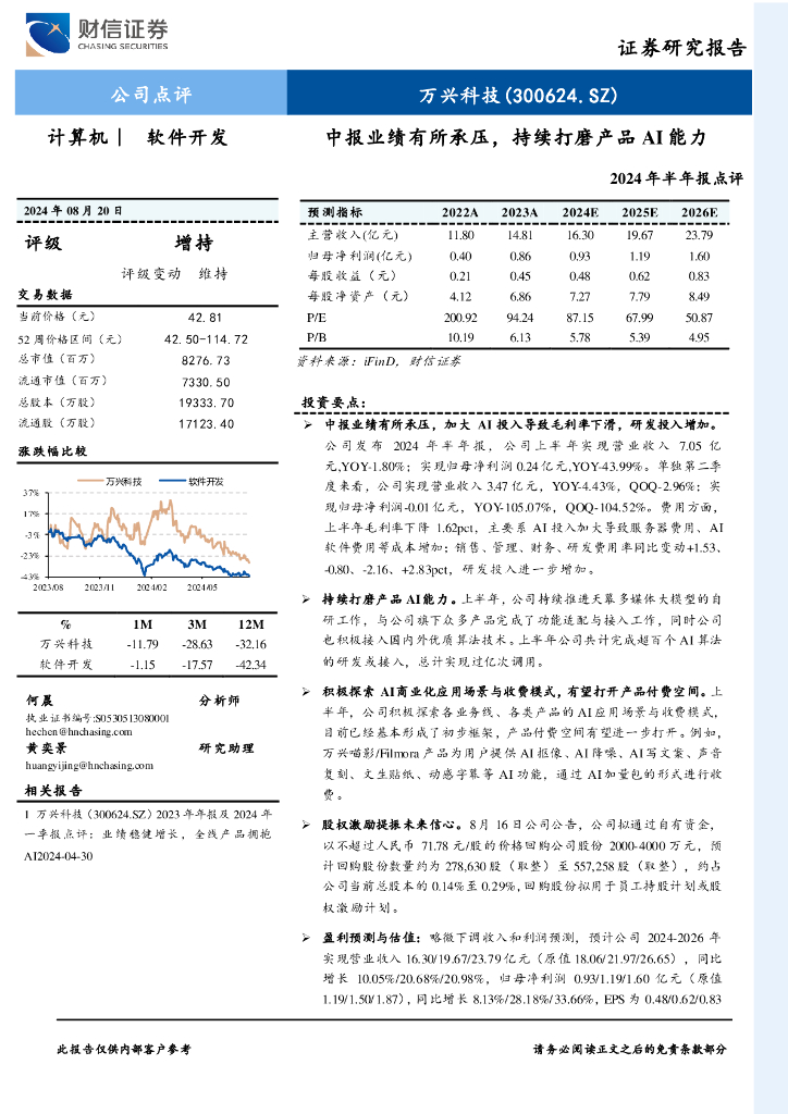 财信证券:万兴科技(300624)-2024年半年报点评:中报业绩有所承压,持续打磨产品AI能力.pdf