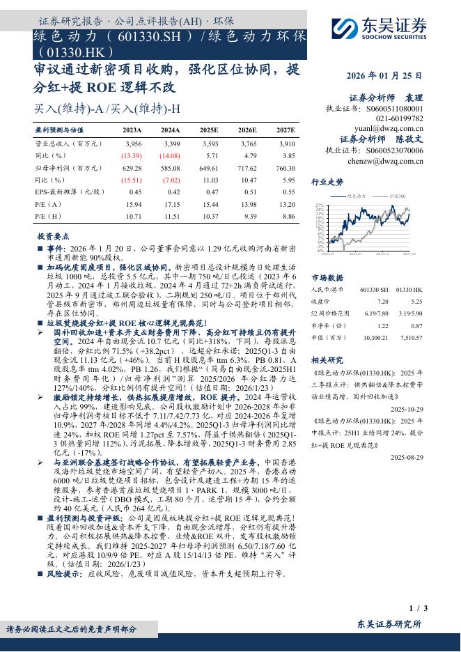 东吴证券:绿色动力(601330)-审议通过新密项目收购,强化区位协同,提分红+提ROE逻辑不改.pdf