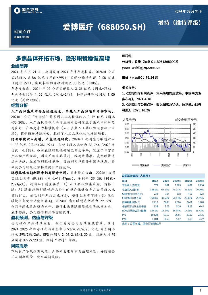 国金证券:爱博医疗(688050)-多焦晶体开拓市场,隐形眼镜稳健高增.pdf