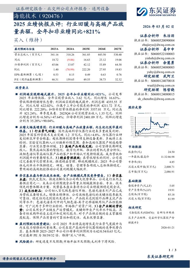 东吴证券:海能技术(920476)-2025业绩快报点评:行业回暖与高端产品放量共驱,全年扣非业绩同比+821%.pdf