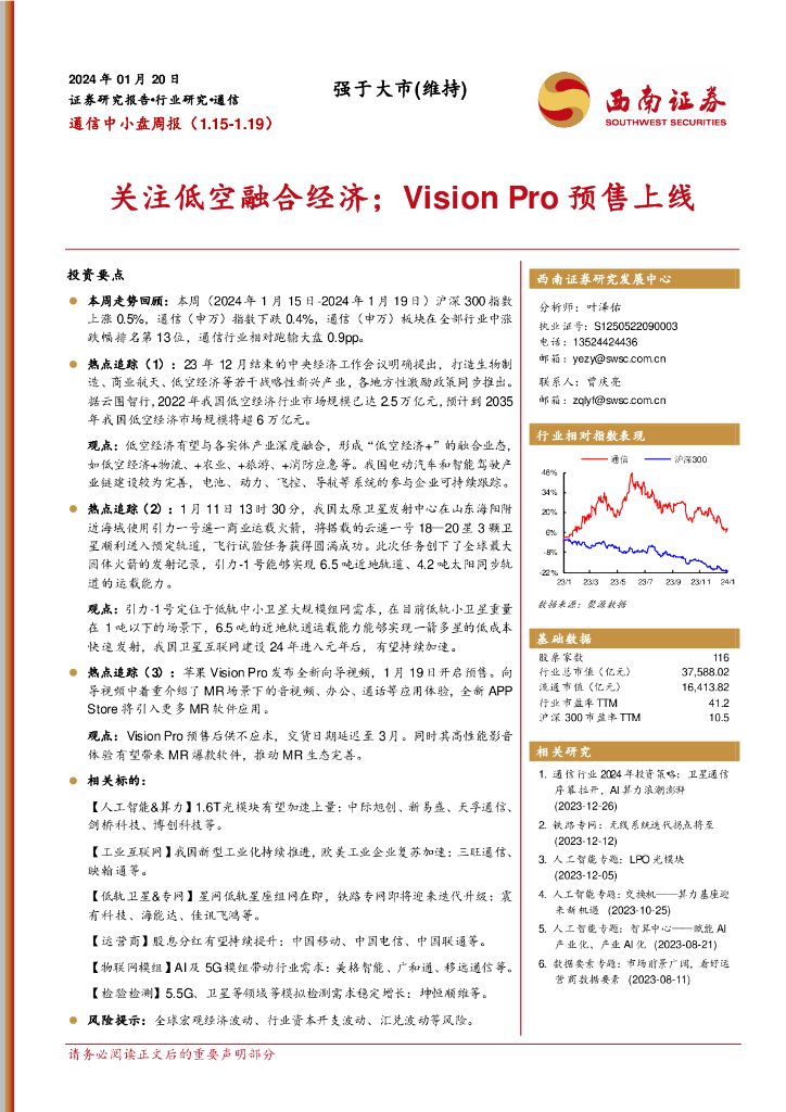 西南证券:通信中小盘周报:关注低空融合经济;Vision Pro预售上线.pdf