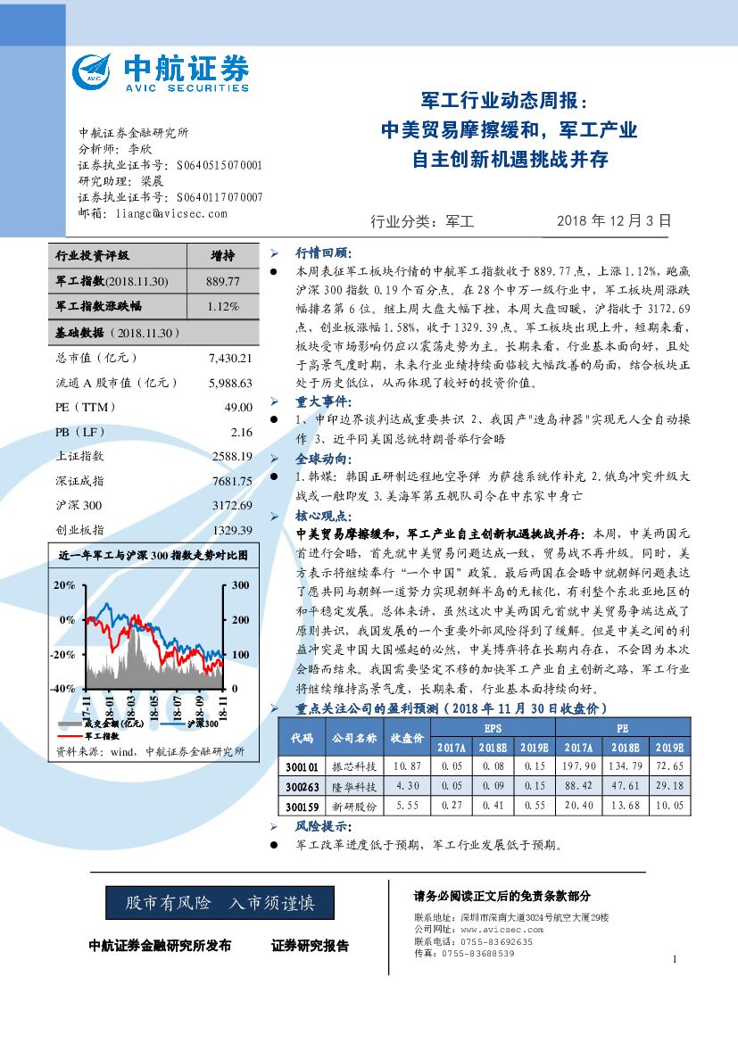 中航证券:军工行业动态周报:中美贸易摩擦缓和,军工产业自主创新机遇挑战并存.pdf