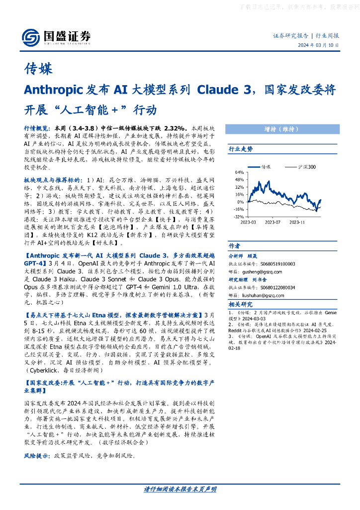 国盛证券:传媒行业:Anthropic发布AI大模型系列Claude 3,国家发改委将开展“人工智能+”行动.pdf