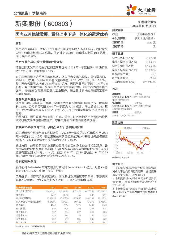 天风证券:新奥股份(600803)-国内业务稳健发展,看好上中下游一体化的运营优势.pdf