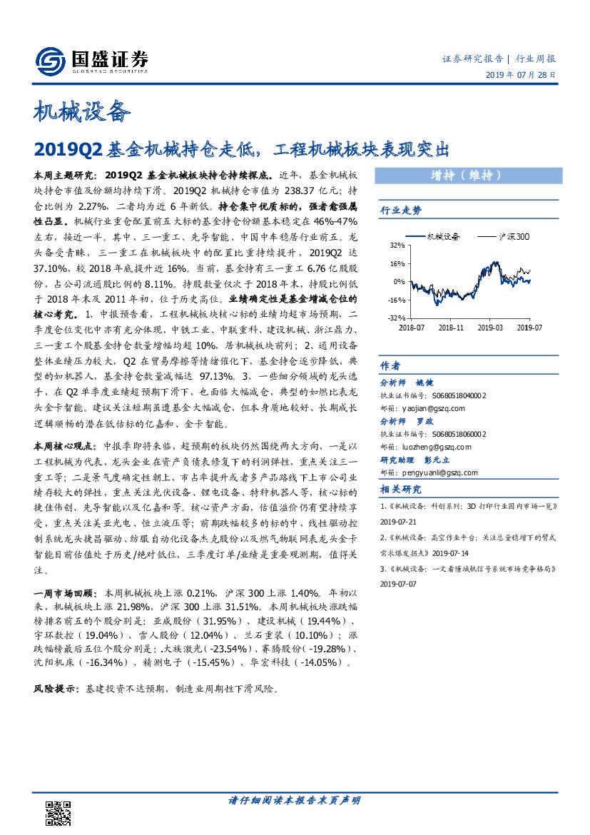 国盛证券:机械设备行业周报:2019Q2基金机械持仓走低,工程机械板块表现突出.pdf