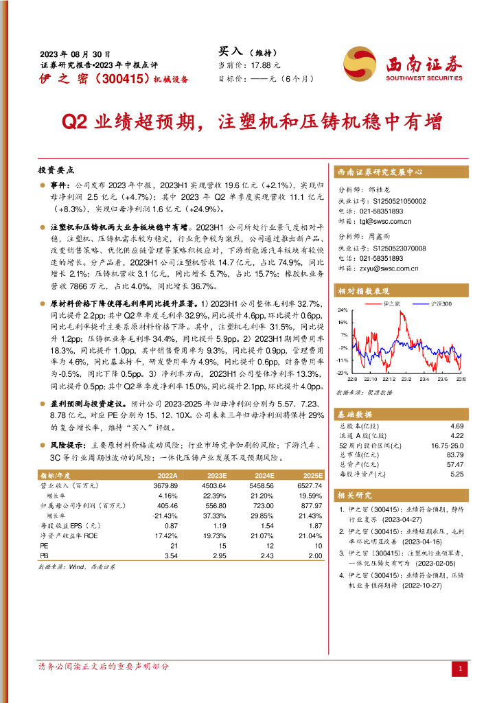 西南证券:伊之密(300415)-Q2业绩超预期,注塑机和压铸机稳中有增.pdf