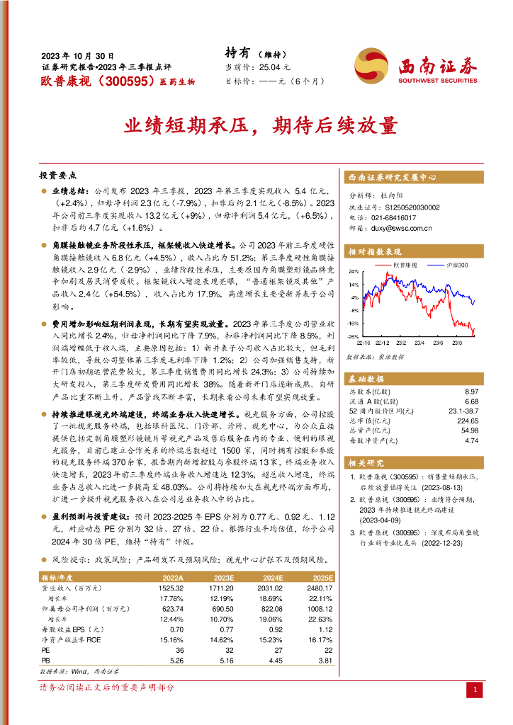 西南证券:欧普康视(300595)-2023年三季报点评:业绩短期承压,期待后续放量.pdf