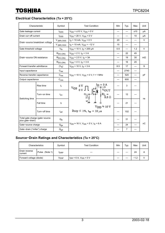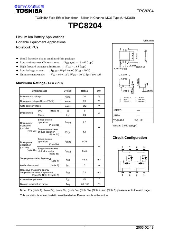 TOSHIBA Field Effect Transistor Silicon N Channel MOS Type (U−MOSII) TPC8204 数据手册.pdf