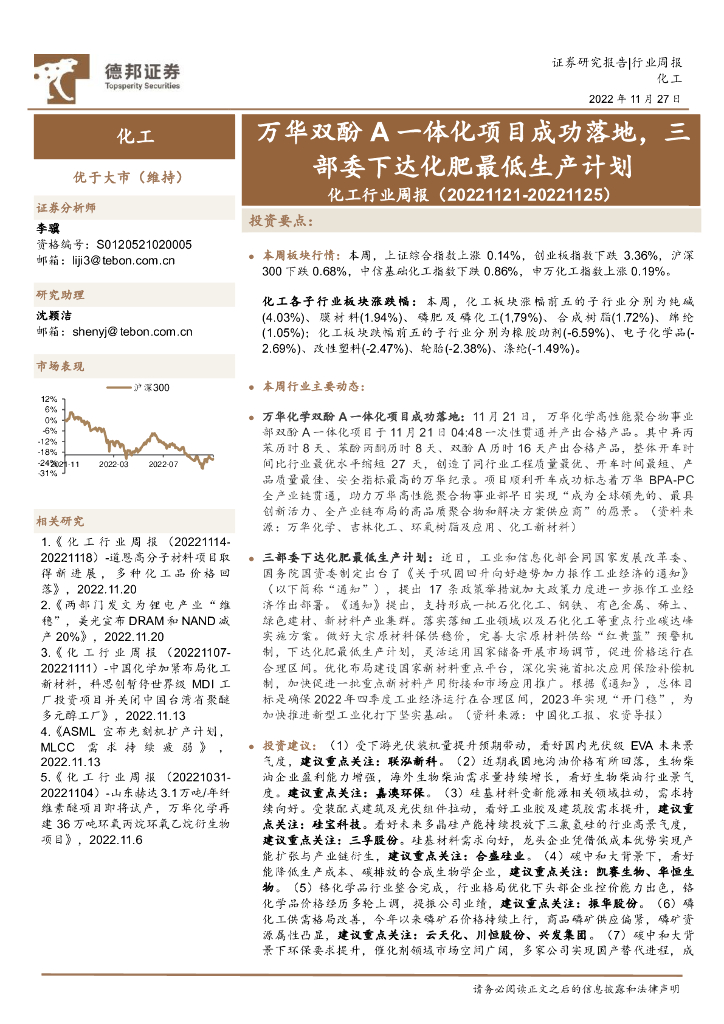 德邦证券:化工行业周报:万华双酚A一体化项目成功落地,三部委下达化肥最低生产计划.pdf
