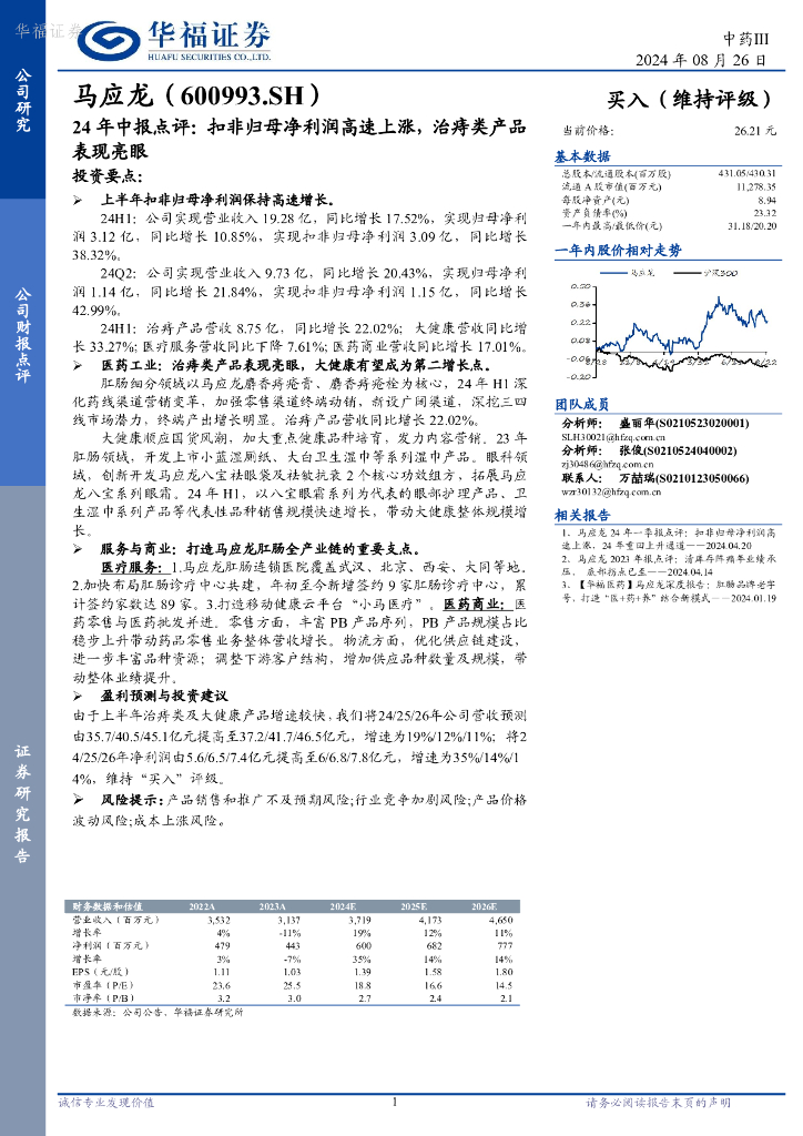 华福证券:马应龙(600993)-24年中报点评:扣非归母净利润高速上涨,治痔类产品表现亮眼.pdf