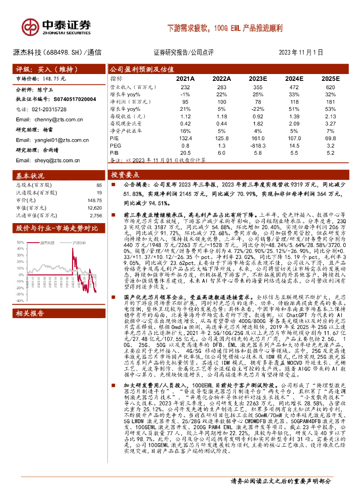 中泰证券:源杰科技(688498)-下游需求疲软,100G EML产品推进顺利.pdf