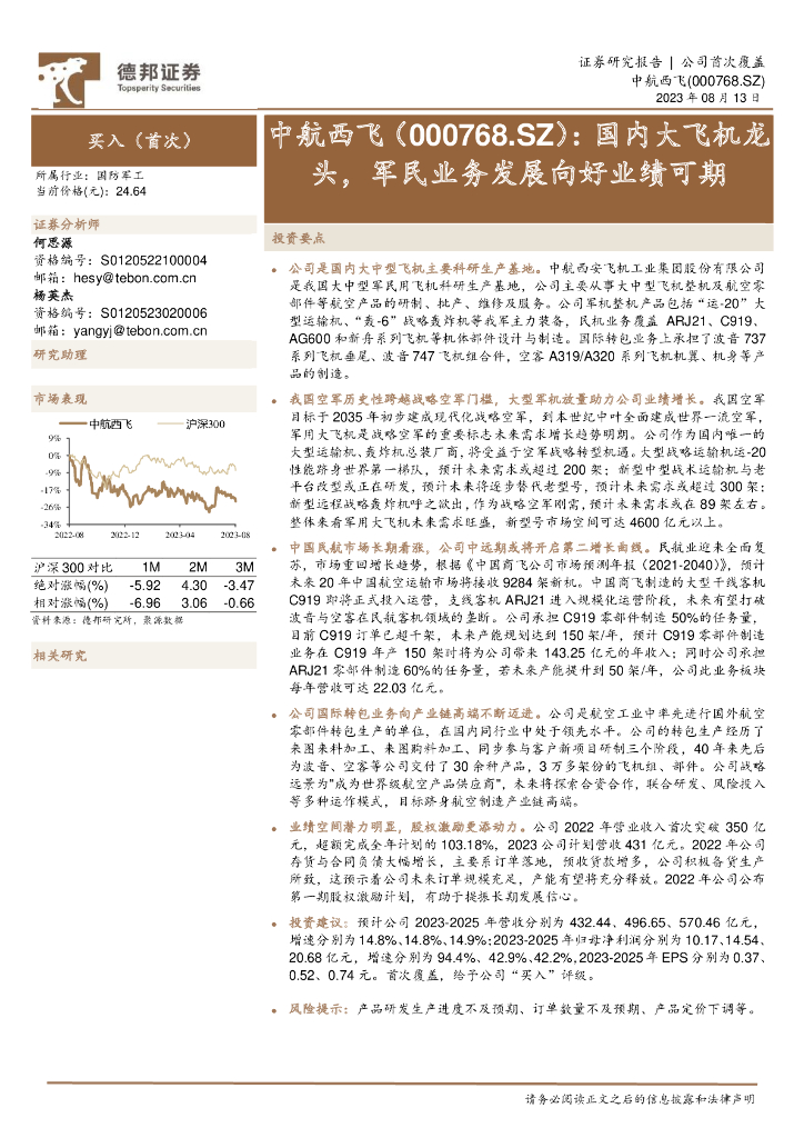 德邦证券:中航西飞(000768)-国内大飞机龙头,军民业务发展向好业绩可期.pdf