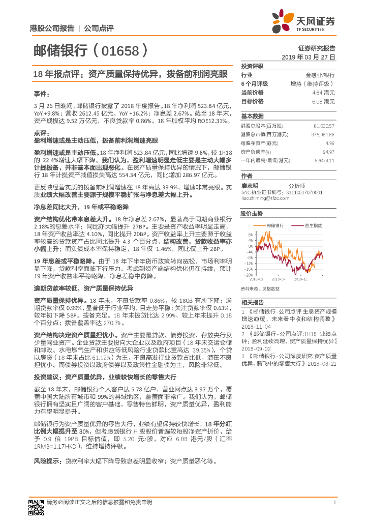 天风证券:邮储银行(01658)港股公司研究报告-18年报点评:资产质量保持优异,拨备前利润亮眼.pdf