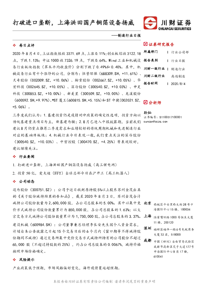 川财证券:制造行业日报:打破进口垄断,上海洪田国产铜箔设备扬威.pdf