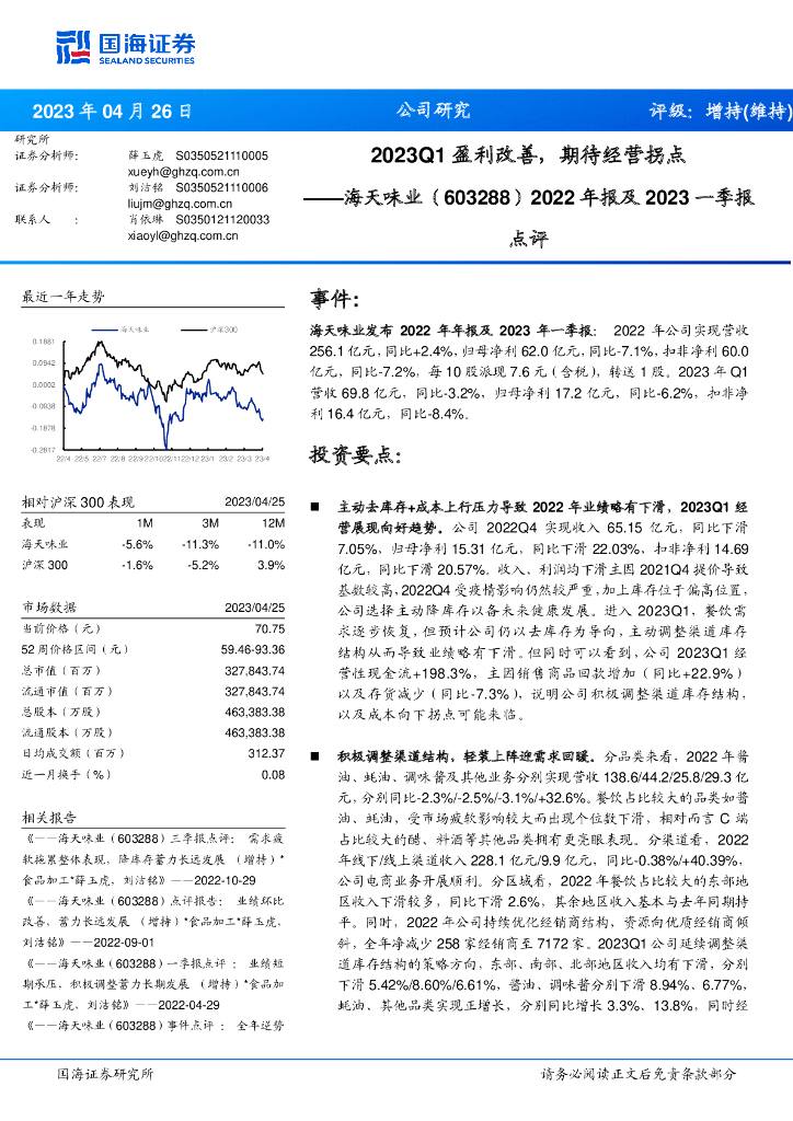 国海证券:海天味业(603288)-2022年报及2023一季报点评:2023Q1盈利改善,期待经营拐点.pdf