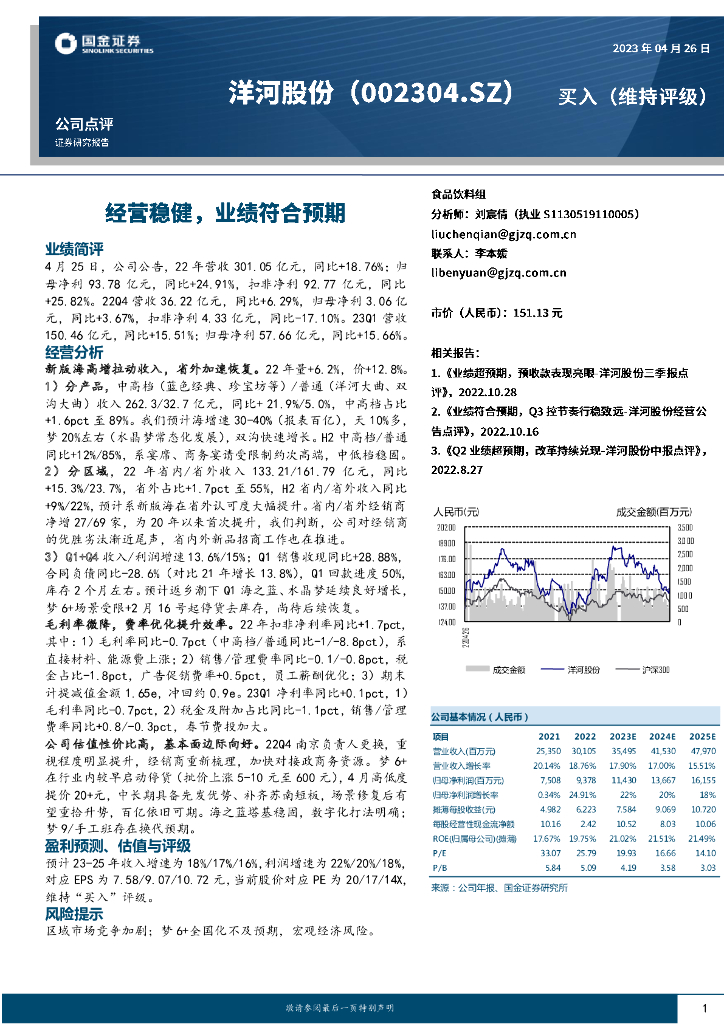 国金证券:洋河股份(002304)-经营稳健,业绩符合预期.pdf