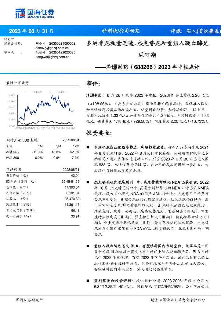 国海证券:泽璟制药(688266)-2023年中报点评:多纳非尼放量迅速,杰克替尼和重组人凝血酶兑现可期.pdf